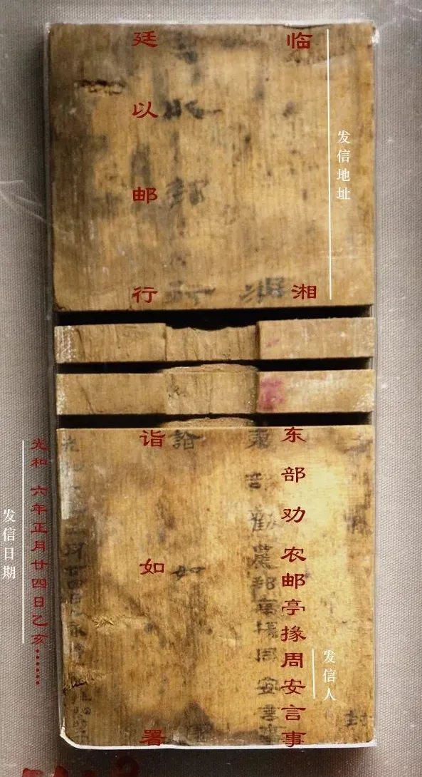 封信函的东西叫检,也叫封检,木字旁。事实上它就是木制的片状物,向上的一面有凹槽,凹槽上面又有三道细槽。凹槽之外的地方写发件人、收件人以及通过什么方式送达等信息,有的还要规定时间,相当于现在的信封。