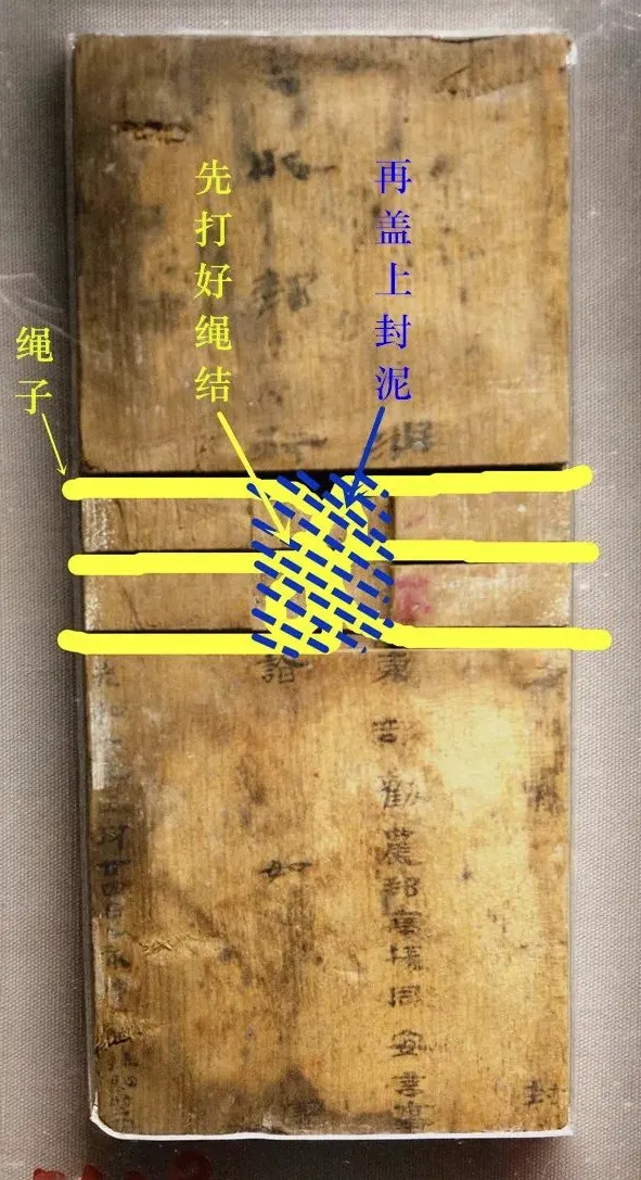 把封检和简牍联系起来的叫缄,丝字旁,实际上也就是绳子。捆绑的时候,这绳子必须嵌入凹槽上面的细槽,绳结也必须系在凹槽部位。然后,将封泥压上去封死,并且盖上印章。这样一来,只有剪断封绳或破坏封泥,才能拆封。